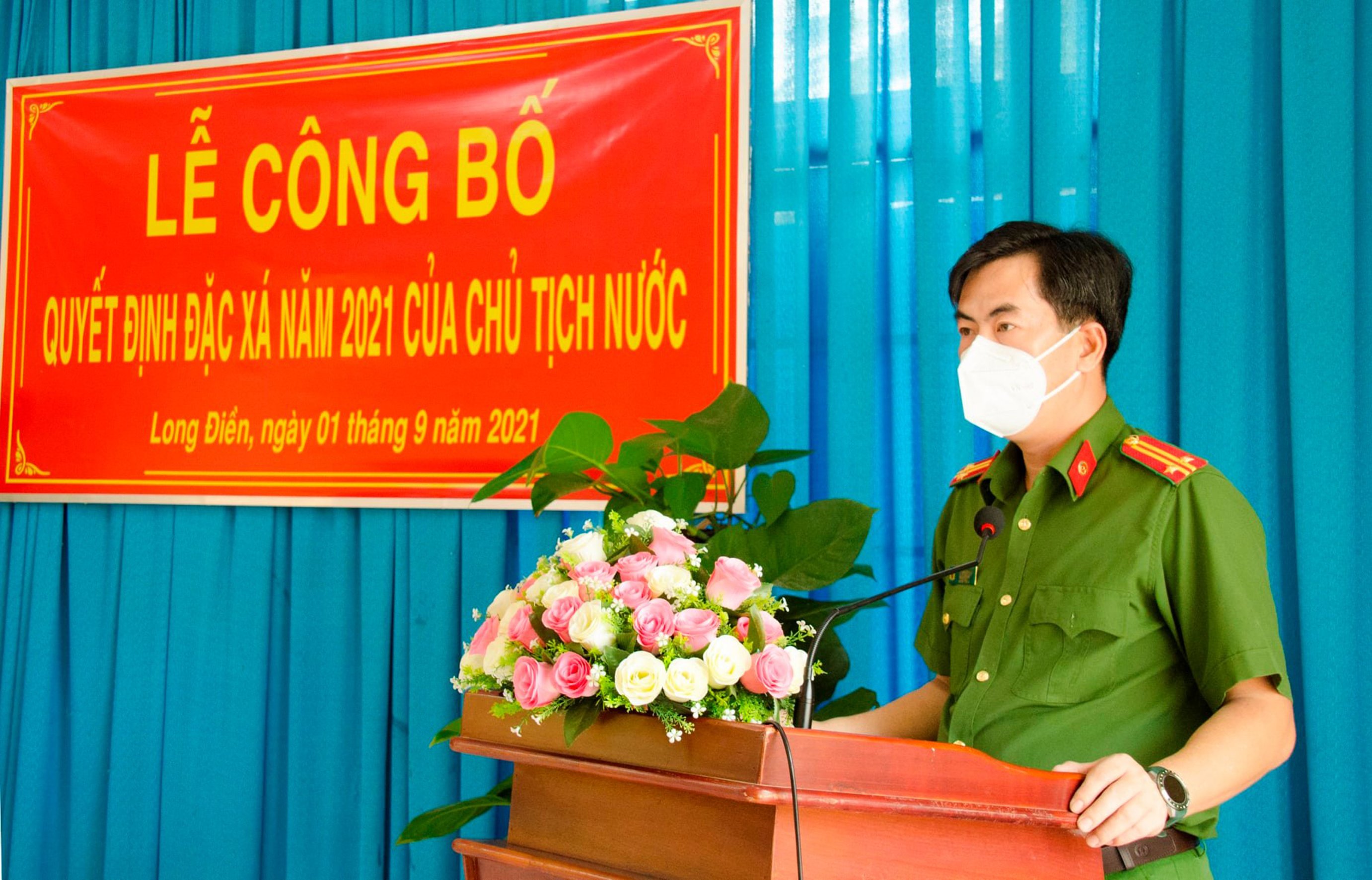 | Trung tá Trần Thanh Hiển, Phó Giám đốc Công an tỉnh đã trao Quyết định đặc xá năm 2021 của Chủ tịch nước cho các phạm nhân. |