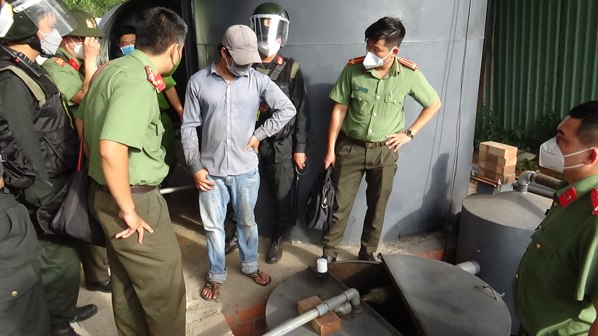 | Công an kiểm tra các bồn chứa và đường ống nấu dầu tại cơ sở |