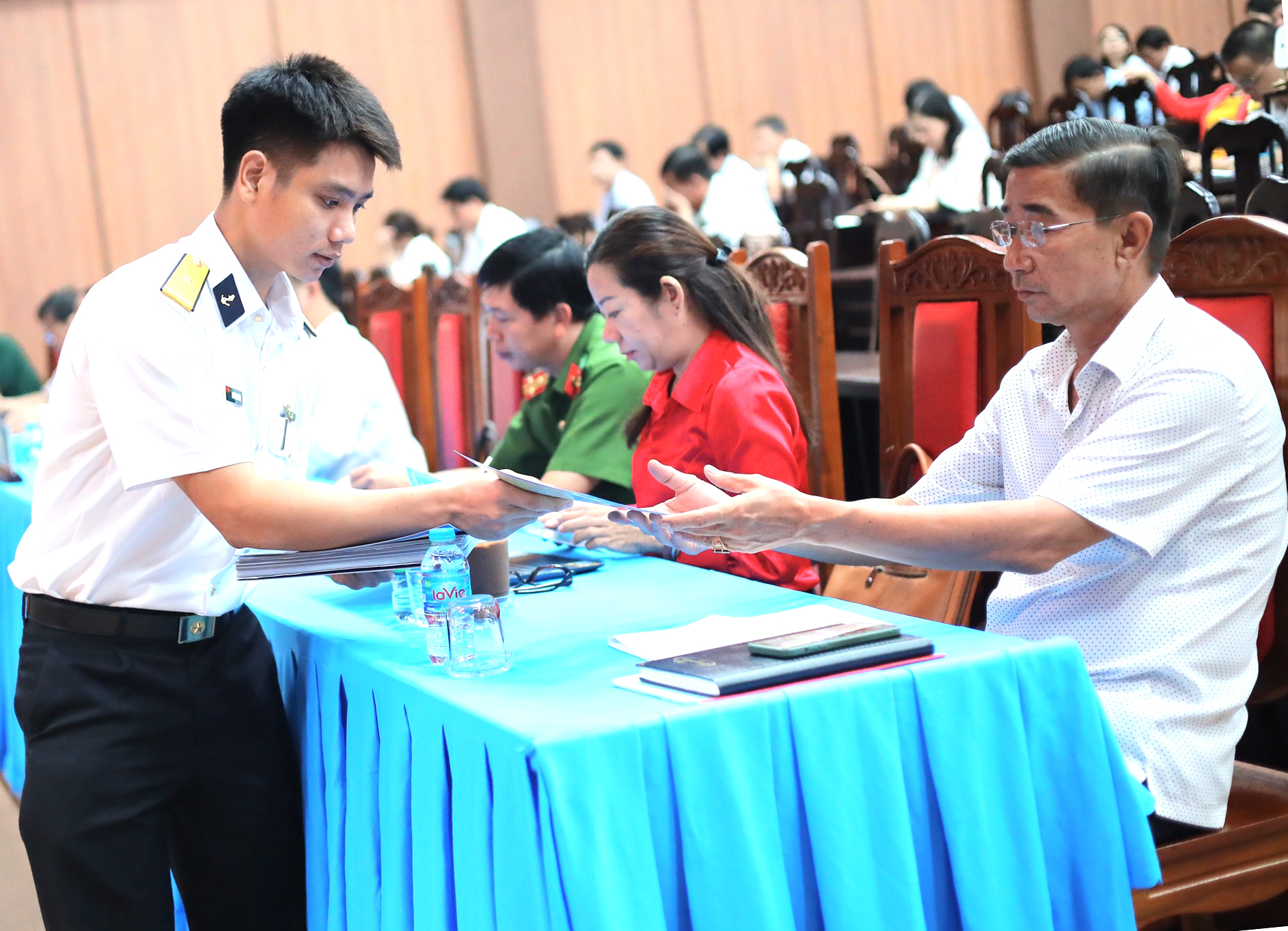 | Cán bộ Lữ đoàn 171 phát tờ rơi tuyên truyền về biển, đảo cho cán bộ, đảng viên huyện Đất Đỏ. |