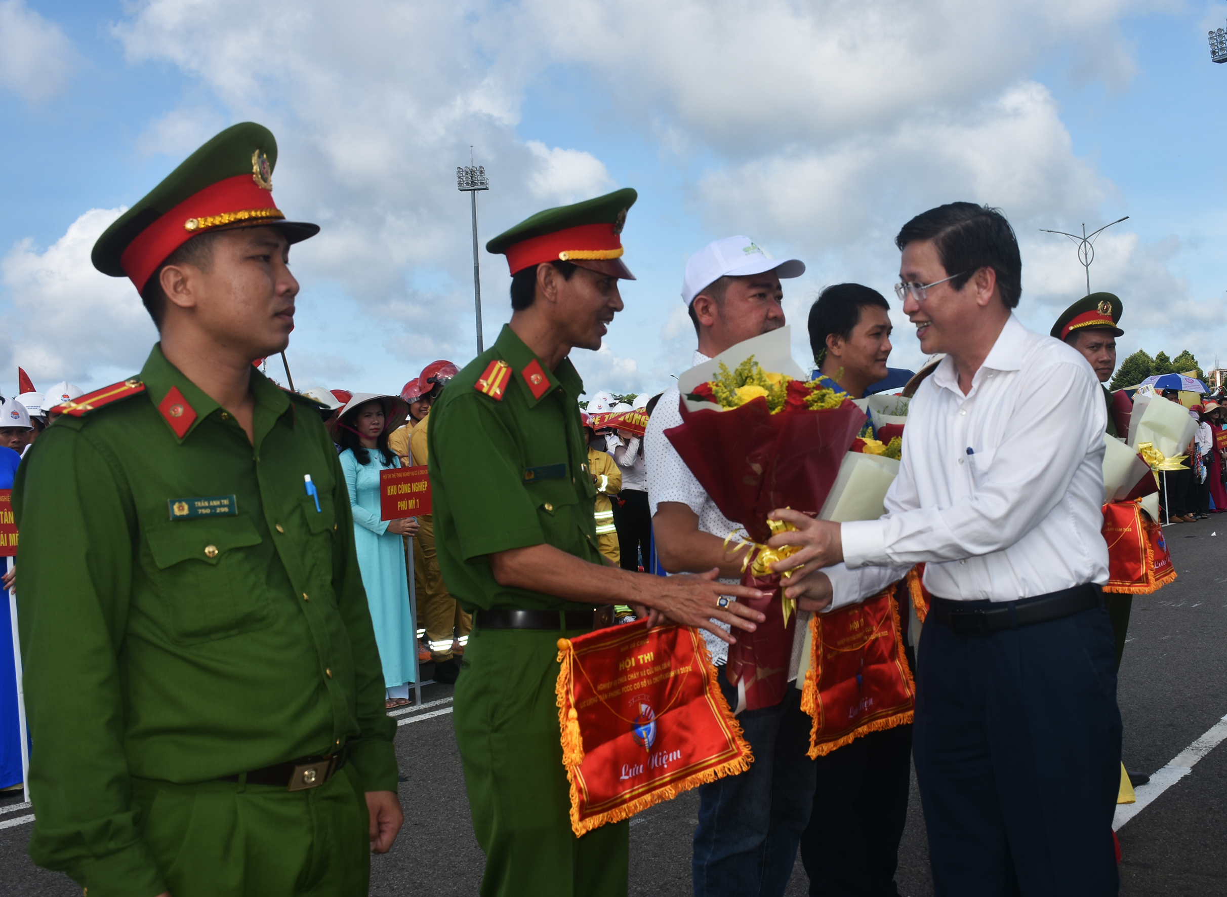 | Ông Lê Ngọc Khánh, Phó Chủ tịch UBND tỉnh, Trưởng Ban chỉ đạo PCCC tỉnh đến dự và tặng hoa, cờ cho các đội thi. |