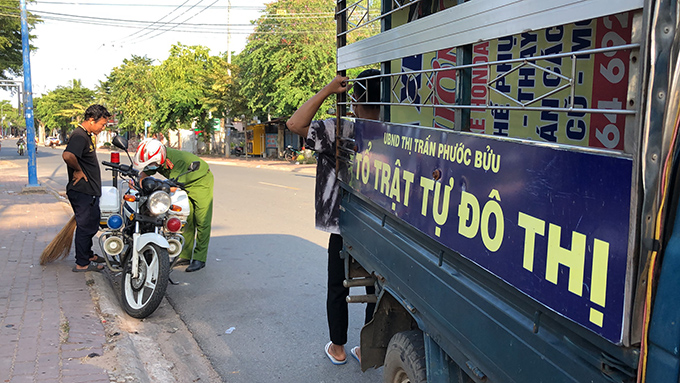 | Lực lượng chức năng TT. Phước Bửu tuần tra, xử lý các trường hợp vi phạm trật tự đô thị trên địa bàn. |