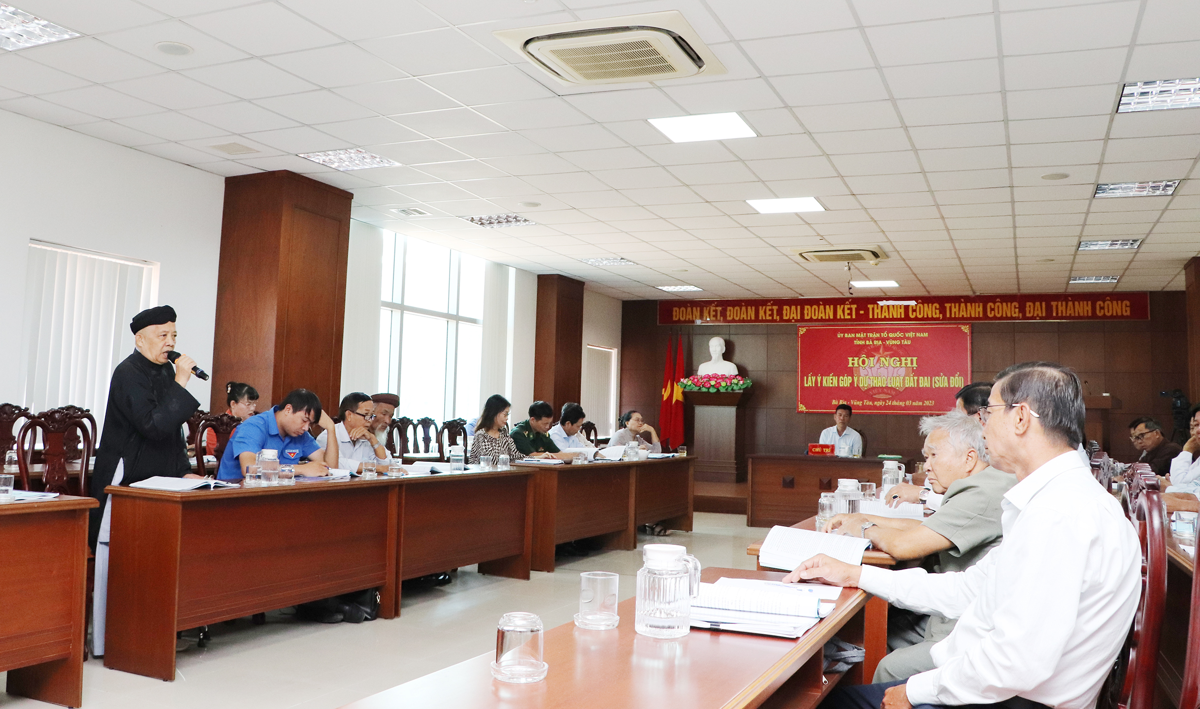 Sáng 24/2, ông Trần Văn Lợi, Phó Chủ tịch UBMTTQ Việt Nam tỉnh chủ trì hội nghị lấy ý kiến góp ý Dự thảo Luật Đất đai (sửa đổi). Hội nghị có sự tham dự của gần 100 đại biểu, đại diện cho UBMTTQ Việt Nam các cấp và khu dân cư.