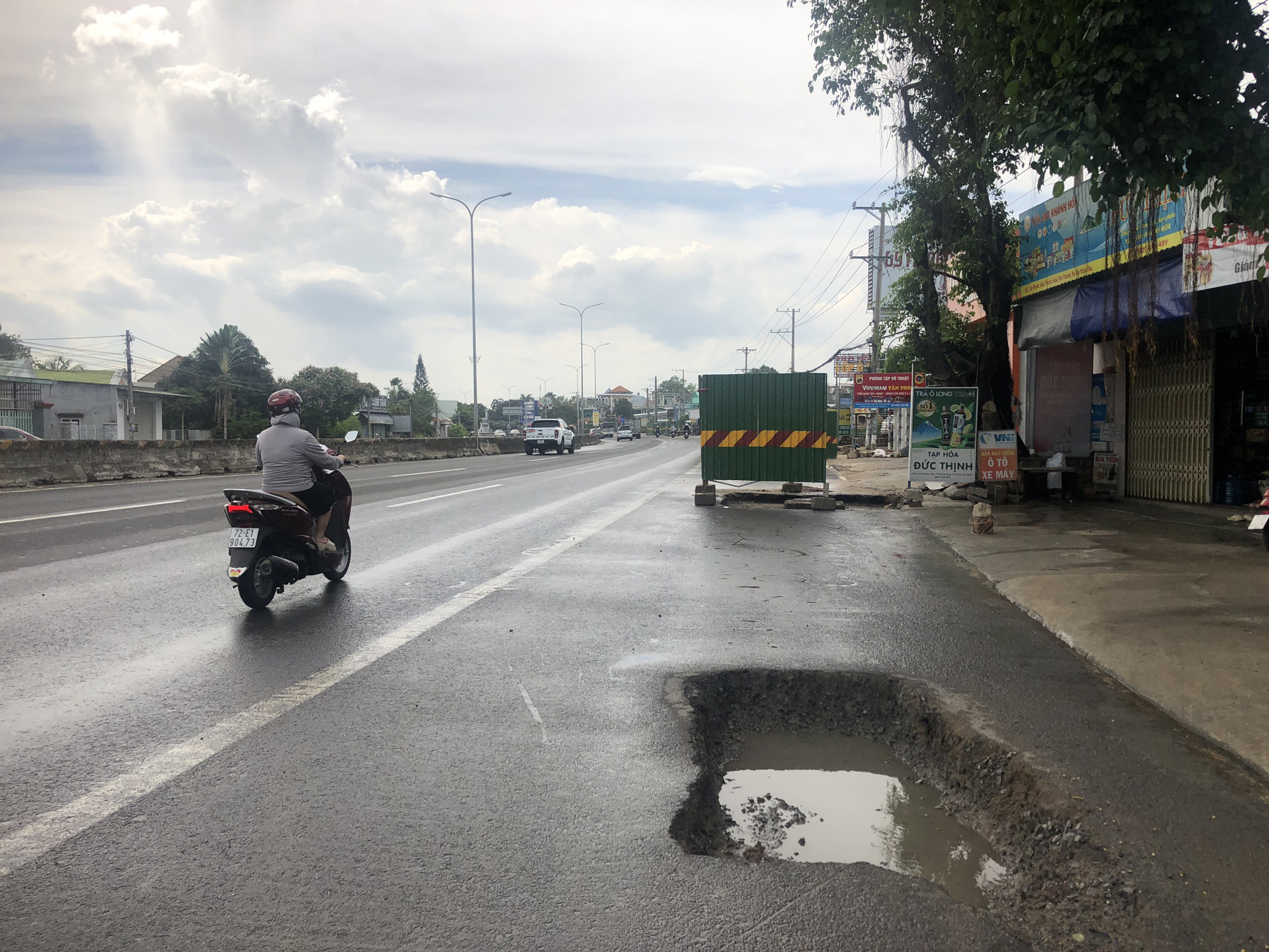 | Hố sâu không rào chắn tại QL51, TX.Phú Mỹ “bẫy” người tham gia giao thông. |