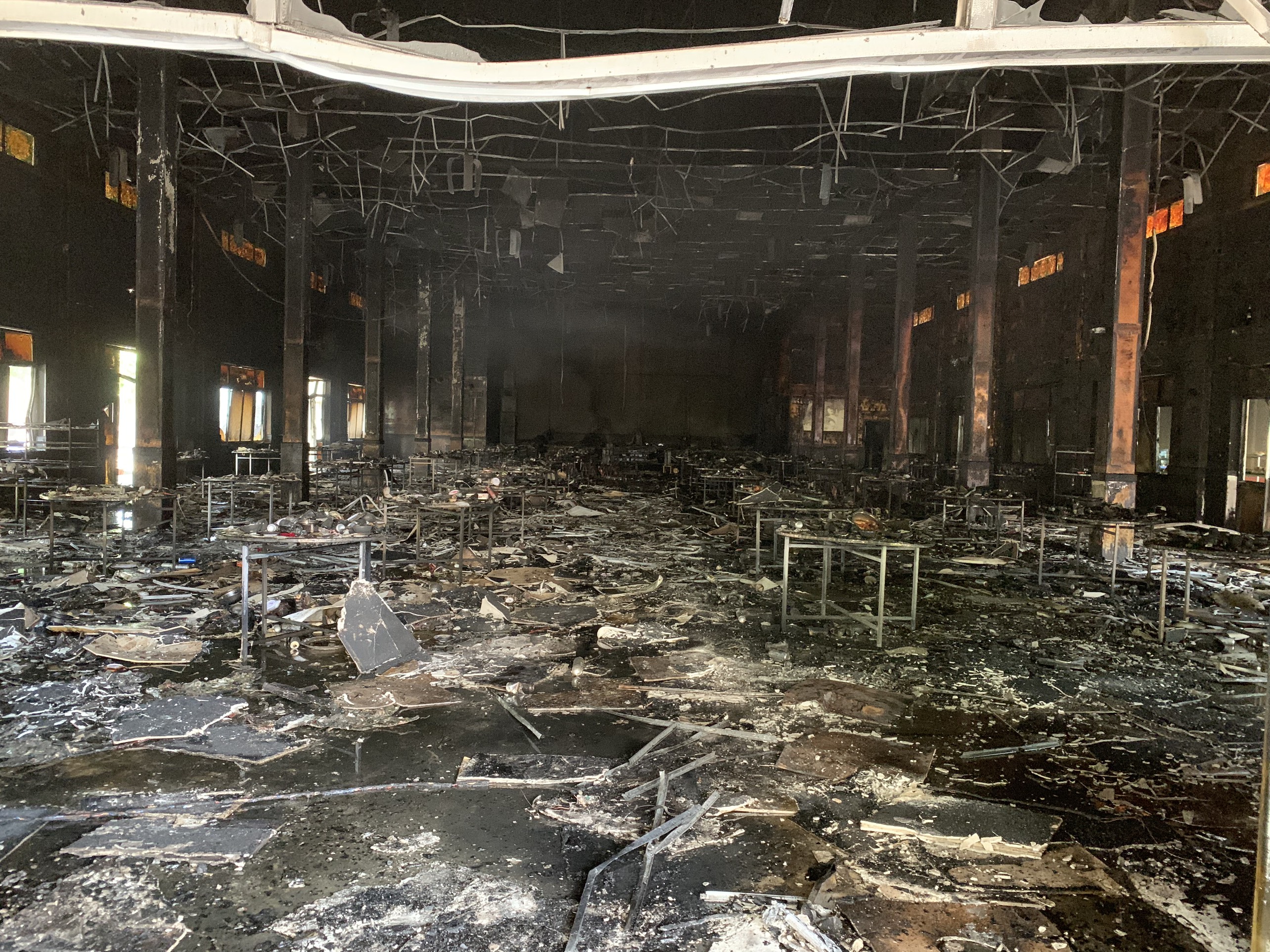 | Vụ hoả hoạn khiến hội trường tổ chức tiếc cưới bị thiêu rụi, thiệt hại khoảng 2 tỉ đồng. |