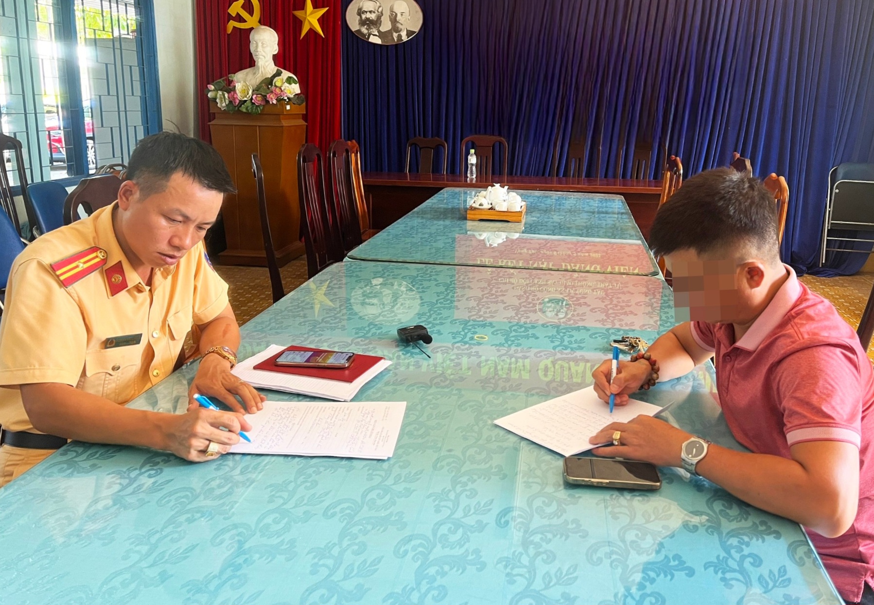 | Cán bộ Đội CSGT làm việc với ông T. |