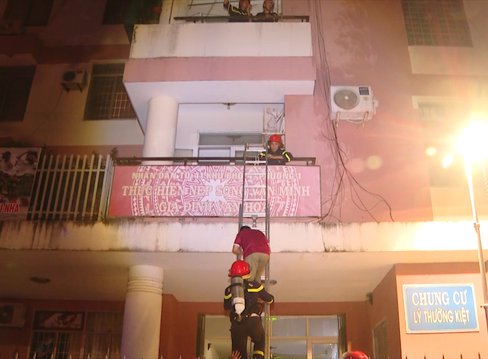 Đám cháy tiếp tục phát triển lớn và lan lên tầng 3 của chung cư, cùng lúc 5 nạn nhân được phát hiện đang bị kẹt do khói và khí độc bao trùm ở tầng 2, tầng 3, không thể tiếp cận để cứu hộ. Trung tá Trần Ngọc Trung, Đội trưởng Đội Cảnh sát PCCC&CNCH triển khai 5 tổ chữa cháy, kịp thời dập tắt đám cháy; tìm kiếm người bị nạn và đưa nạn nhân qua thang, bàn giao cho lực lượng y tế.