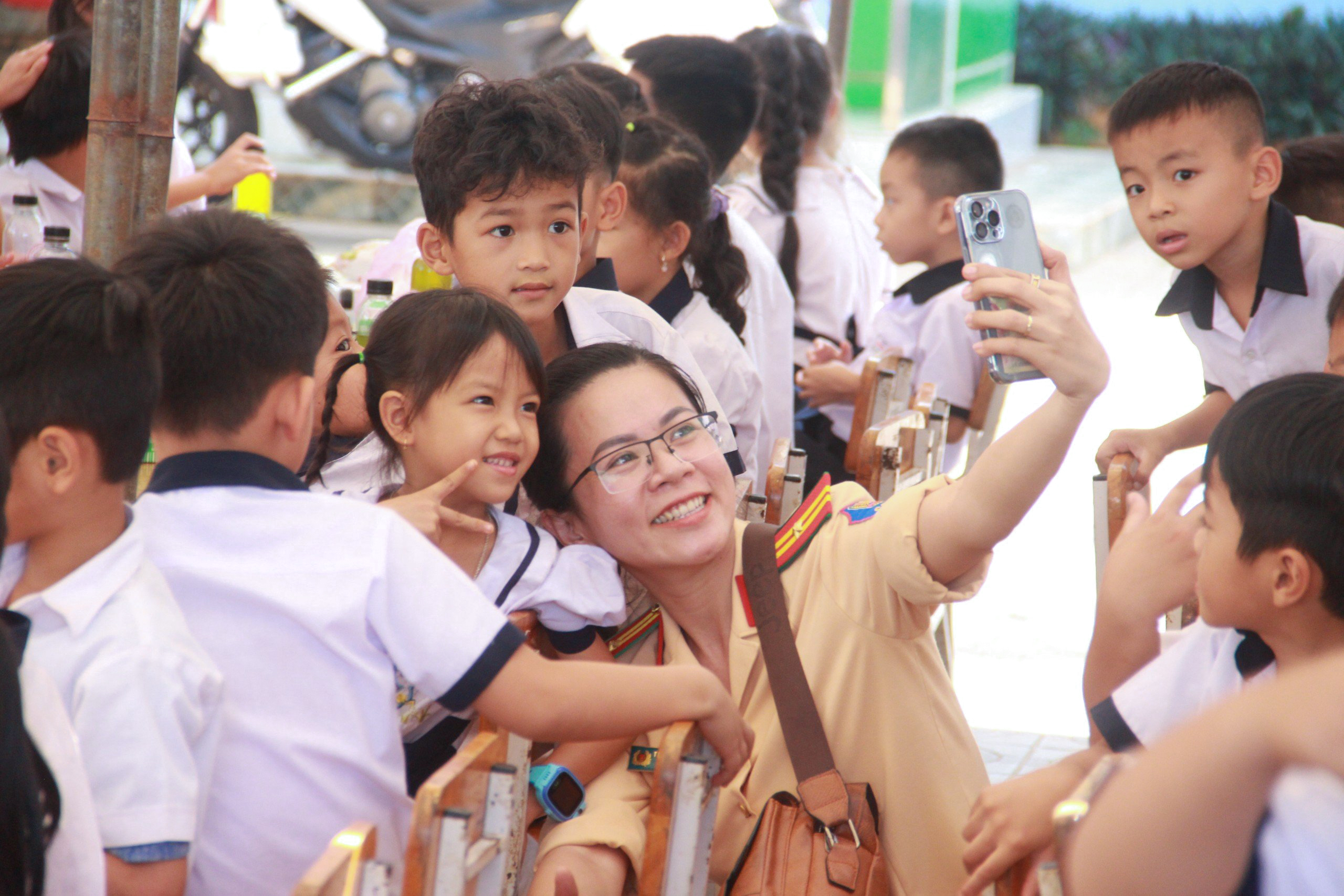 | Các em HS thích thú, chụp hình kỉ niệm cùng nữ cán bộ CSGT |