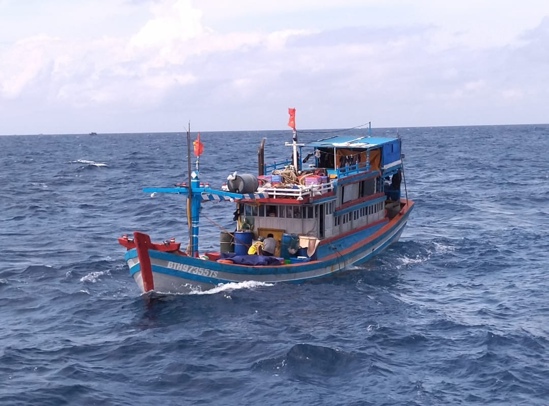 | Tàu cá BTh 97355 tiếp cận nhà giàn DK1/7 xin hỗ trợ cấp cứu ngư dân bị nạn. |