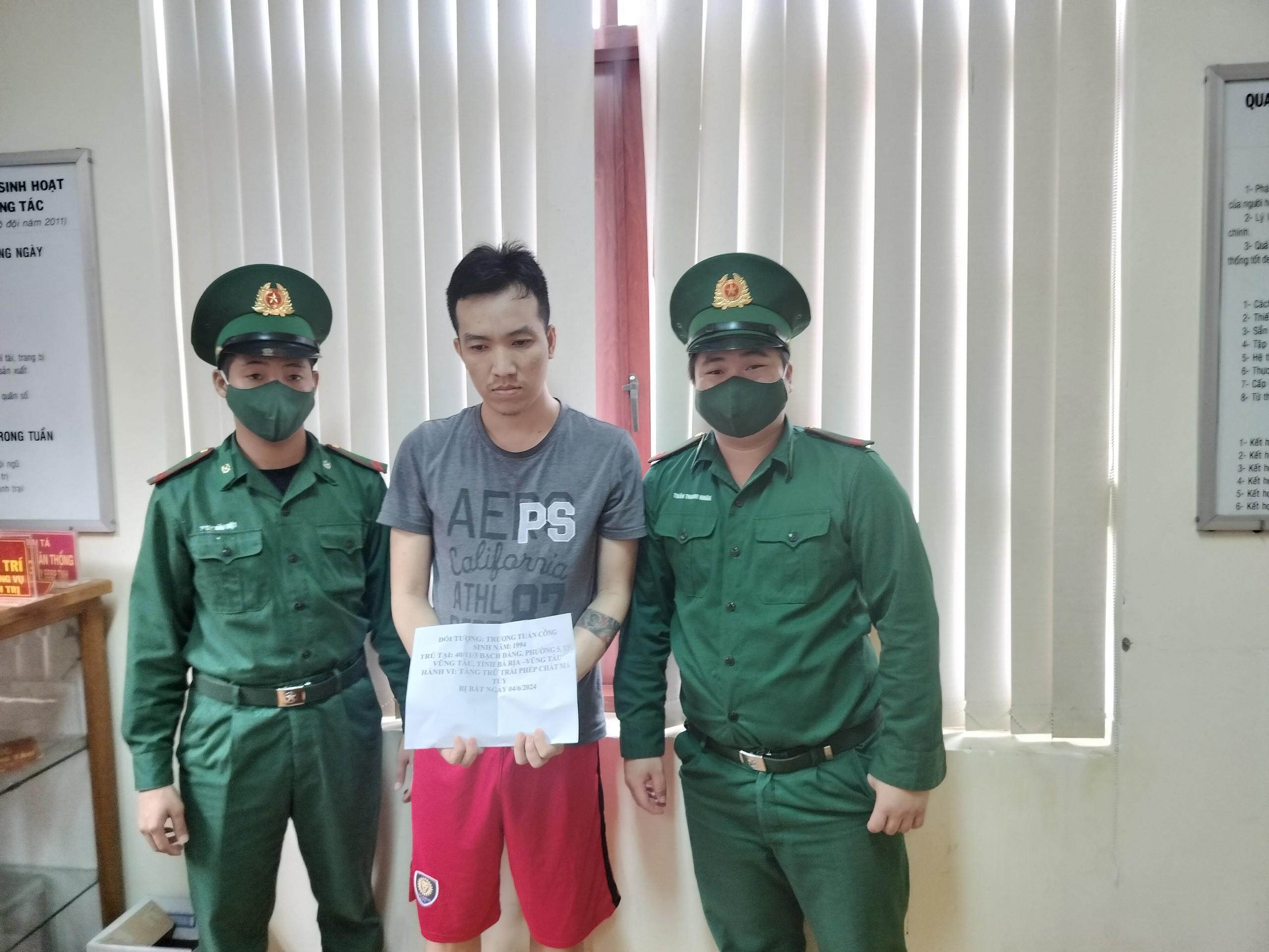 Hơn 15 giờ chiều 4/6, Phòng Phòng, chống ma túy và tội phạm Bộ đội Biên phòng tỉnh phối hợp với Đồn Biên phòng Bến Đá bắt quả tang Trương Tuấn Công (SN 1994, ngụ TP.Vũng Tàu) về hành vi tàng trữ trái phép chất ma túy.