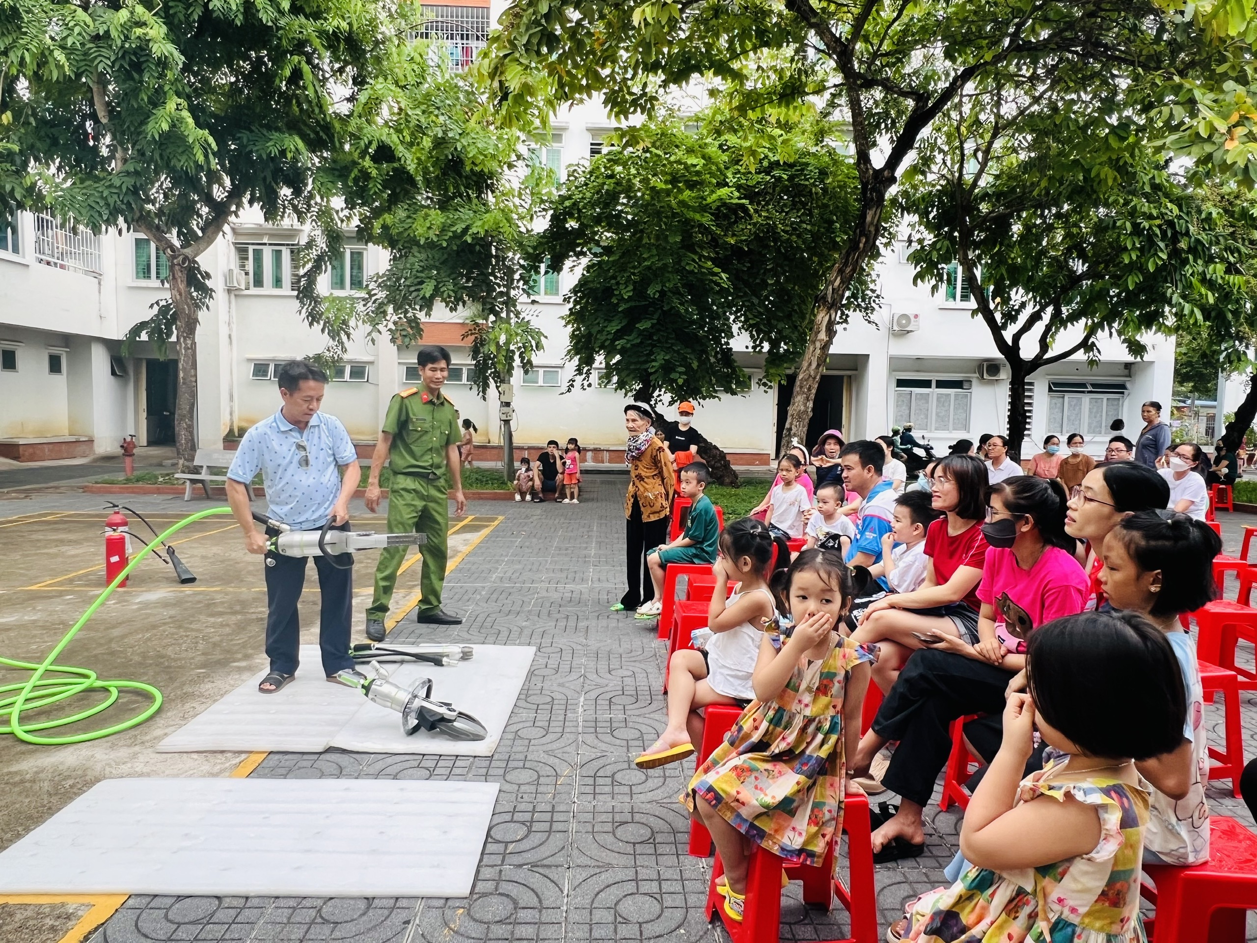 Các cư dân đều được thực hành trải nghiệm việc sử dụng bình PCCC, vòi, lăng chữa cháy, các phương tiện PCCC chuyên dùng...