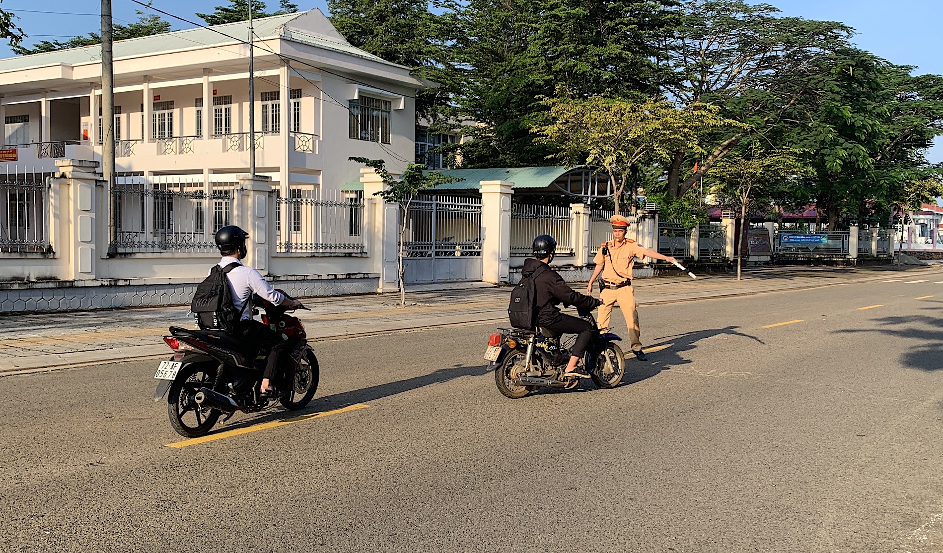 Lúc 7h, CSGT dừng xe em T.A.T. (học sinh lớp 12) khi em đang lưu thông trên đường Trần Hưng Đạo (thị trấn Ngãi Giao). Học sinh này vi phạm lỗi điều khiển xe không gương chiếu hậu và không có giấy đăng ký xe.