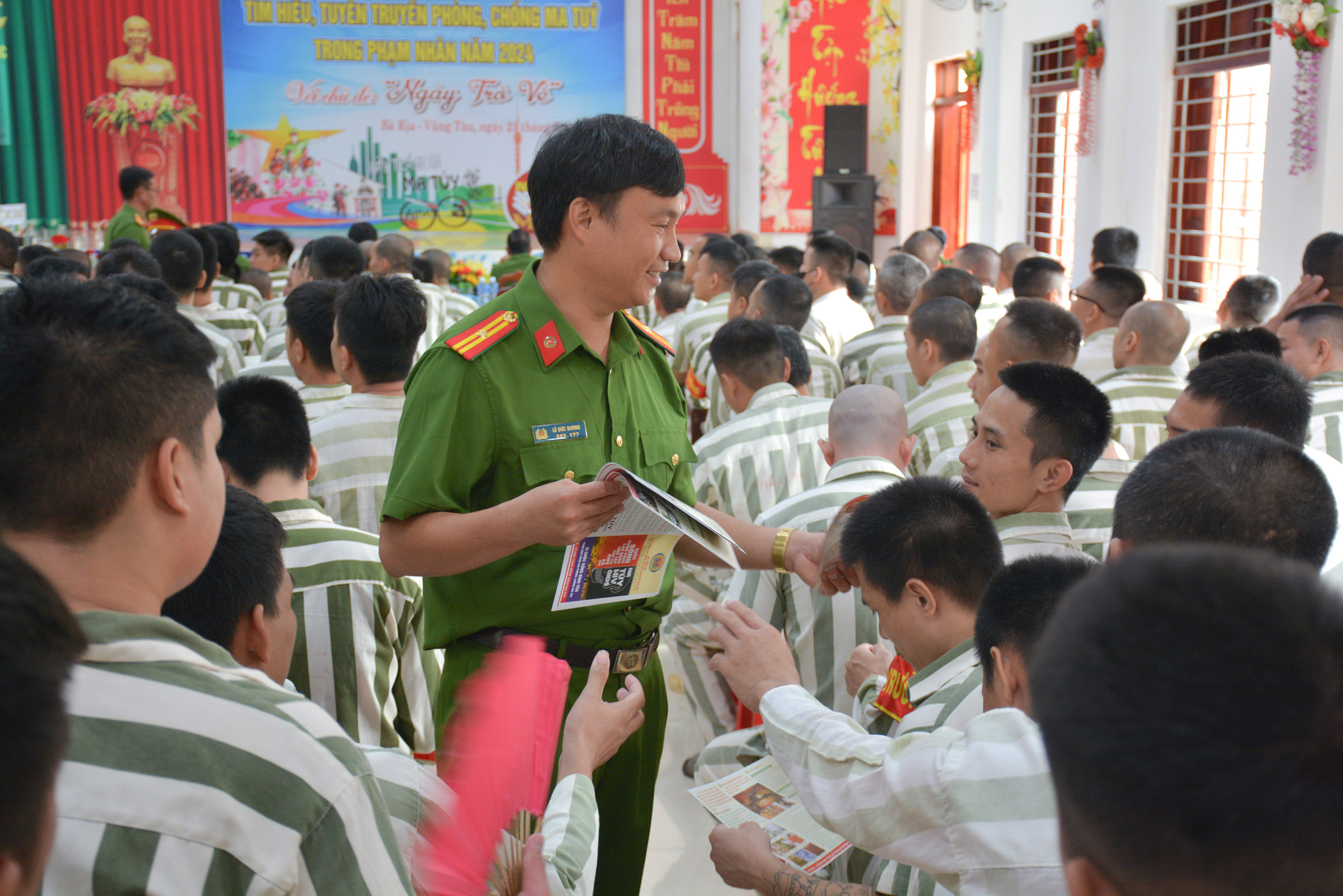 Thiếu tá Ninh Văn Công, Đội trưởng Đội giáo dục và hồ sơ (Trại giam Xuyên Mộc) chia sẻ, trại giam hiện quản lý hơn 3.000 phạm nhân, trong đó hơn 40% là tội phạm liên quan đến ma túy. Trại giam đã triển khai nhiều hoạt động giáo dục nhằm nâng cao nhận thức cho phạm nhân, giúp họ hiểu rõ tác hại của ma túy và tạo động lực để họ từ bỏ con đường tội lỗi.