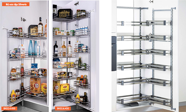 Phụ kiện góc tủ bếp với hệ thống ray trượt, kéo thông minh nên dễ dàng sử dụng và tận dụng tối đa không gian góc chết của tủ bếp dưới.