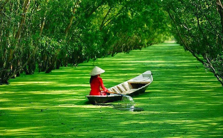 Khu du lịch Trà Sư trong những ngày đón mừng những công trình xanh độc nhất của thiên nhiên đặc ân cho nơi đây, những điều mà điểm du lịch sinh thái trước nước lũ tràn về đã “trình làng” giới mộ đạo check-in danh này luôn khiến cho người thưởng ngoạn phải ngẩn ngơ. Điều đặc biệt của rừng tràm mùa nước nổi làm biết bao hồn thơ phải “say sắc xanh” lại không phải là những “nhành liễu” tràm đong đưa trước gió, thoảng hương mùi hoa tràm dịu nhẹ trong không khí hay một mái nhà xanh được từng hàng tràm bện với nhau che mát dọc theo con đường công du quanh khu rừng, mà chính là một tấm thảm bèo xanh ngắt, trải khắp 850ha bề mặt của khu rừng. Đã từng dạo bước trên thân trúc bạch long nằm trườn dài xuyên rừng, du khách mới có thể biết đến cảm giác đắm mình vào khoảng xanh thiên nhiên bát ngát, thả hồn vào những tình khúc của dàn đồng ca thiên điểu, để được tận hưởng thú vui tao nhã, điền viên mà nhà thơ Nguyễn Bỉnh Khiêm đã từng miêu tả trong dòng thơ của ông: