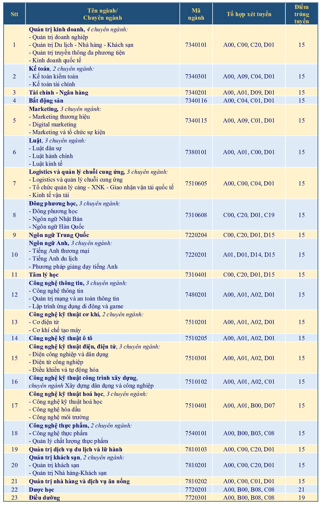 Bảng điểm chuẩn các ngành, chuyên ngành