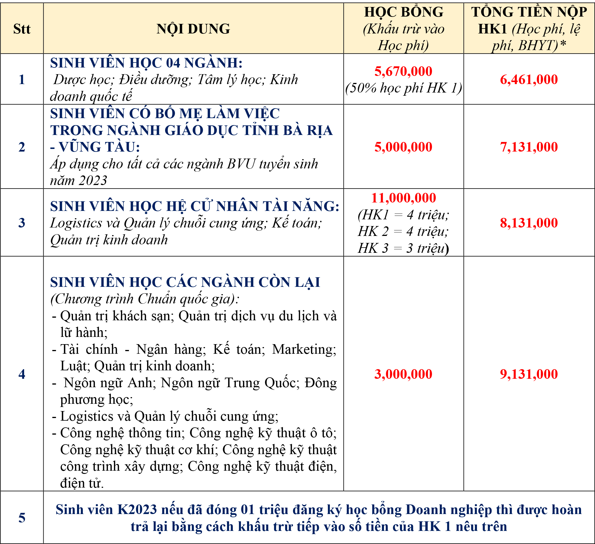 3.1. Học bổng, hoc phí nhập học và các khoản lệ phí: