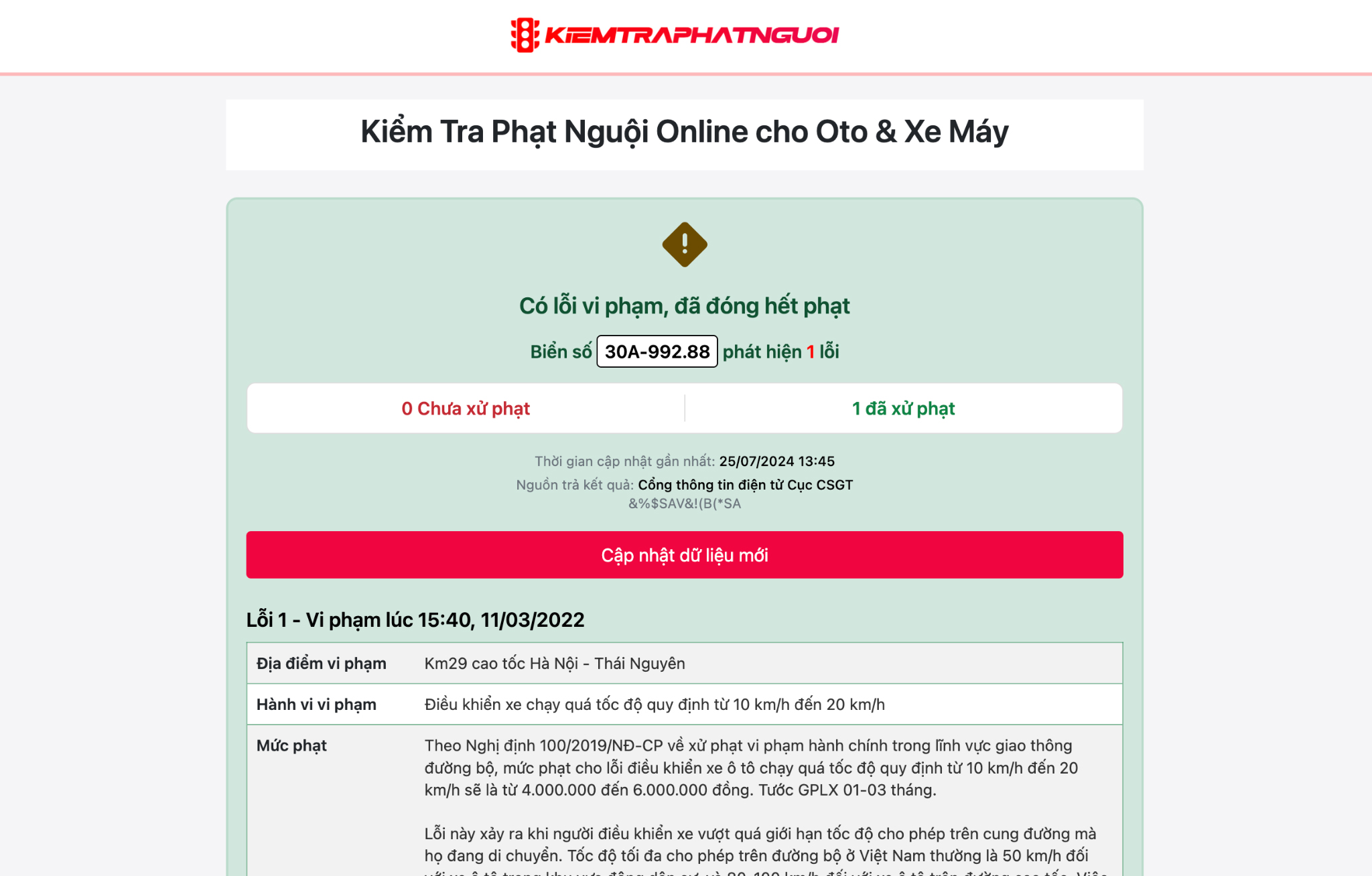 * Nếu có vi phạm, thông tin chi tiết như thời gian, địa điểm và lỗi vi phạm sẽ được hiển thị.