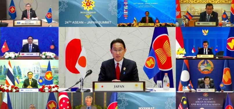 | Thủ tướng Nhật Bản Fumio Kishida (giữa) dự Hội nghị cấp cao ASEAN - Nhật Bản theo hình thức trực tuyến, ngày 27/10/2021. |