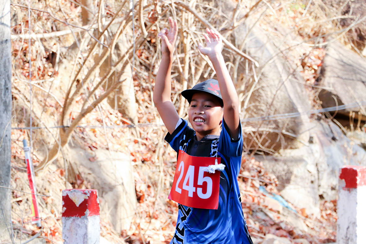 | Một VĐV nhí phấn khởi khi hoàn thành phần thi của mình tại giải. Ảnh: NHẬT LINH |