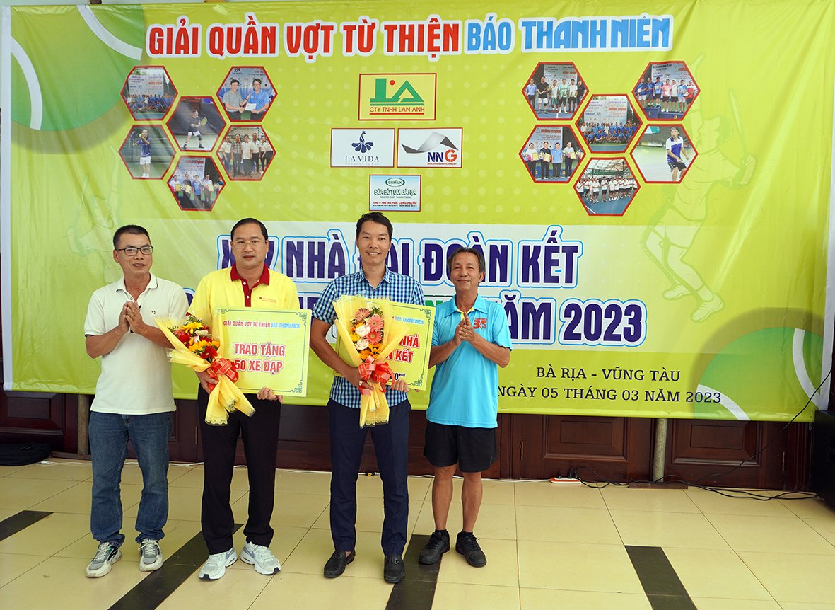 | Thông qua giải đấu năm nay, các DN, mạnh thường quân ủng hộ 100 triệu đồng xây nhà đại đoàn kết cho người có hoàn cảnh khó khăn và 50 xe đạp cho HS nghèo hiếu học. Trong ảnh: Ông Nguyễn Quang Thông (bìa phải), nguyên Tổng Biên tập Báo Thanh niên và lãnh đạo Văn phòng tại Đông Nam Bộ trao bảng tượng trưng tài trợ cho đại diện các địa phương. |