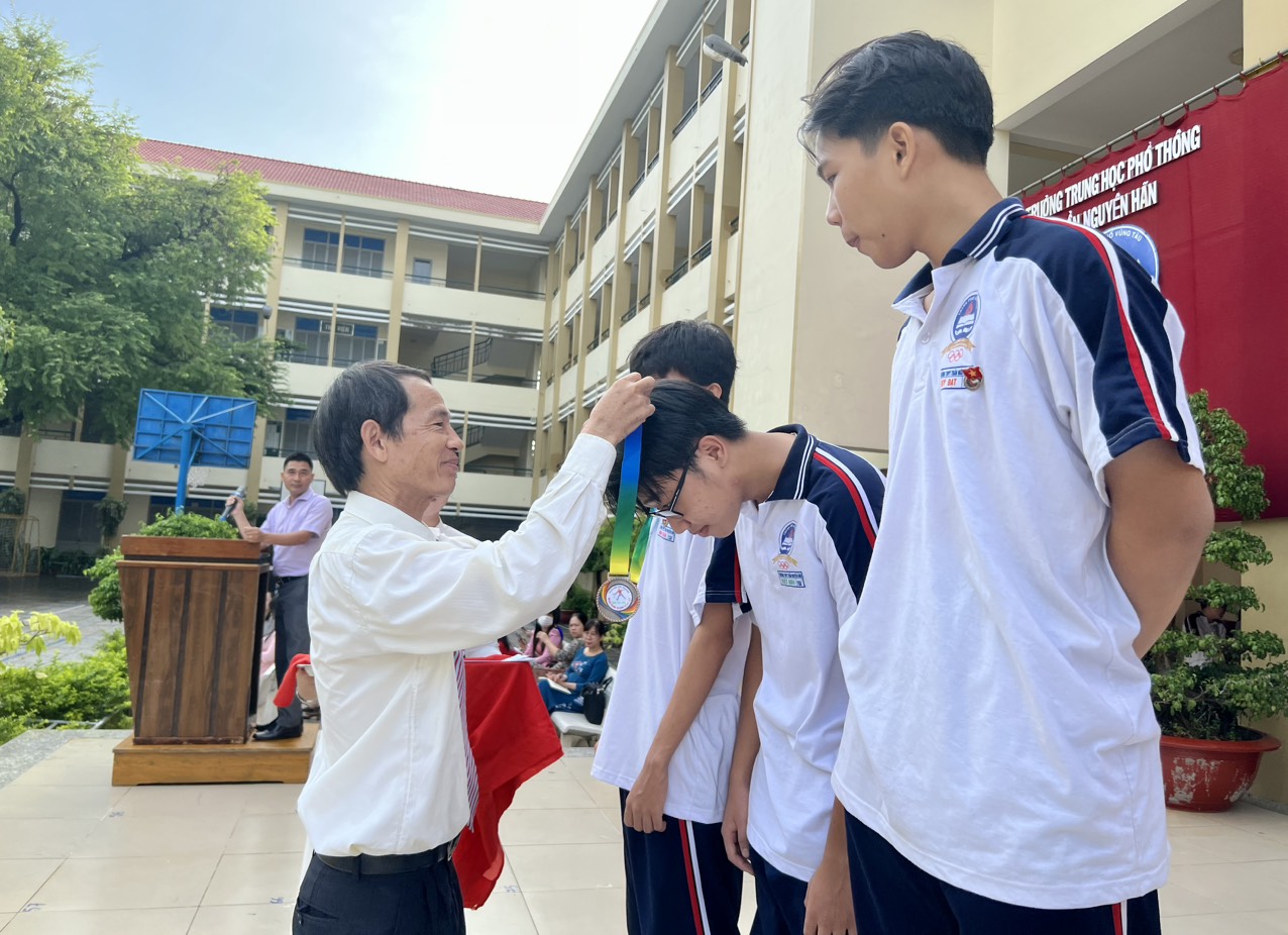 | Thầy Phan Ngọc Tấn, Hiệu trường Trường THPT Trần Nguyên Hãn trao giải cho các VĐV. |