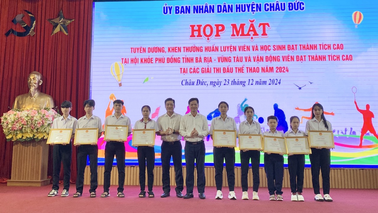 Tại buổi họp mặt, UBND huyện Châu Đức đã khen thưởng 56 VĐV trên địa bàn huyện đạt thành tích tại các giải thi đấu thể thao năm 2024.