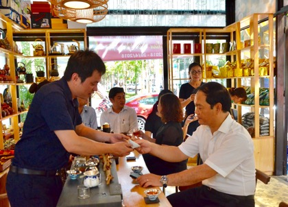 | Anh Phi Long, chủ Không gian Văn hóa trà Phi Long Tea giới thiệu với đồng chí Mai Ngọc Thuận, Ủy viên Ban Thường vụ Tỉnh ủy, Bí thư Thành ủy Vũng Tàu về các dụng cụ pha trà. |