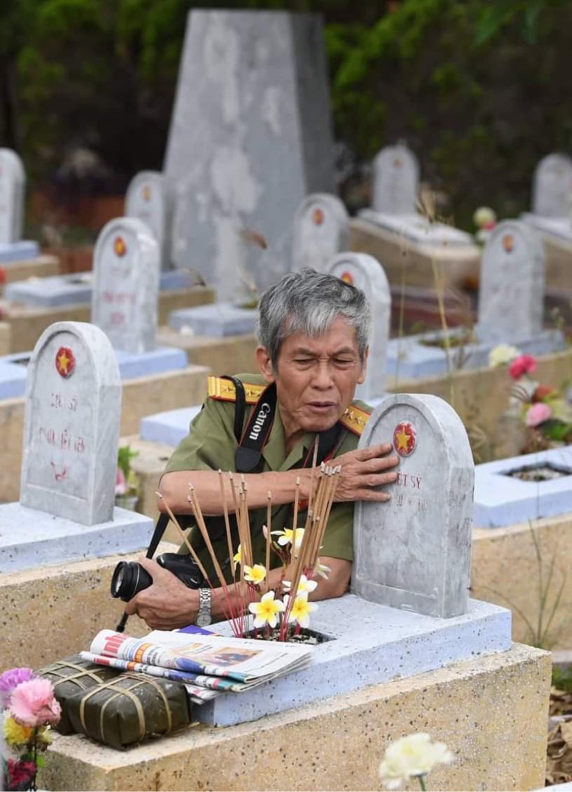 | Nghệ sĩ nhiếp ảnh, Đại tá Trần Văn Hồng (Trần Hồng) bên mộ liệt sĩ Lê Đình Dư, nhà báo chiến trường (nguyên PV báo QĐND) - tại Nghĩa trang liệt sĩ Gio Linh (Quảng Trị), tháng 7/2022. |
