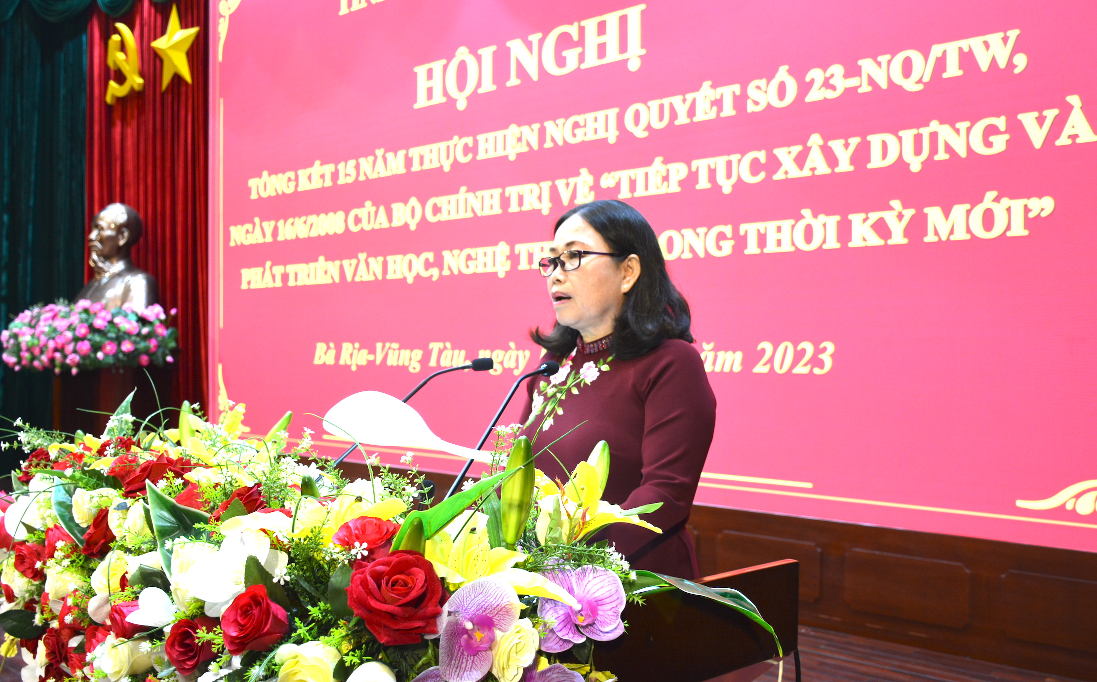 Báo cáo tại hội nghị, ông Nguyễn Văn Xinh, Trưởng Ban Tuyên giáo Tỉnh ủy cho biết, qua 15 năm thực hiện Nghị quyết số 23, văn học, nghệ thuật tỉnh Bà Rịa - Vũng Tàu đã có những bước phát triển toàn diện và mạnh mẽ với dòng mạch chính là “chủ nghĩa yêu nước và nhân văn, gắn bó với dân tộc”.