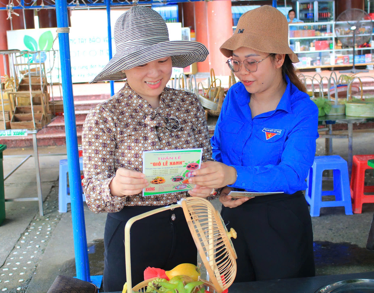 | Đoàn viên thanh niên Côn Đảo hướng dẫn khách soạn Giỏ lễ xanh. |