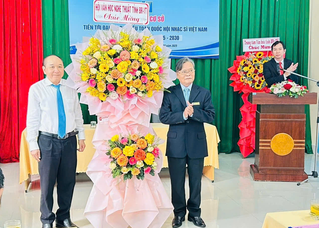 | Nhạc sĩ Trần Vương Thạch, Phó Chủ tịch Hội Nhạc sĩ Việt Nam tặng hoa chúc mừng Ban Chấp hành Chi Hội Nhạc sĩ Việt tỉnh nhiệm kỳ 2025-2030. |
