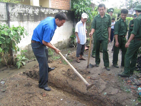 | Ông Hoàng Đăng Chinh, Phó Bí thư Thường trực Đảng ủy phường Phước Nguyên cùng người dân, lực lượng vũ trang khơi thông cống rãnh, bảo đảm vệ sinh môi trường trên địa bàn phường. |