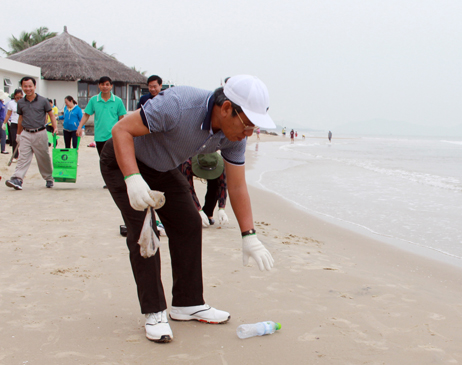 | Đồng chí Nguyễn Lập, Tỉnh ủy viên, Chủ tịch UBND TP.Vũng Tàu nhặt rác trên bãi biển. |
