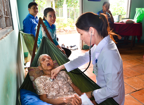| Bác sĩ của CLB Thầy thuốc trẻ huyện Đất Đỏ khám bệnh cho Mẹ Việt Nam Anh hùng Cao Thị Xuyến (SN 1924, trú tại khu phố Hòa Hội, thị trấn Đất Đỏ, huyện Đất Đỏ). |