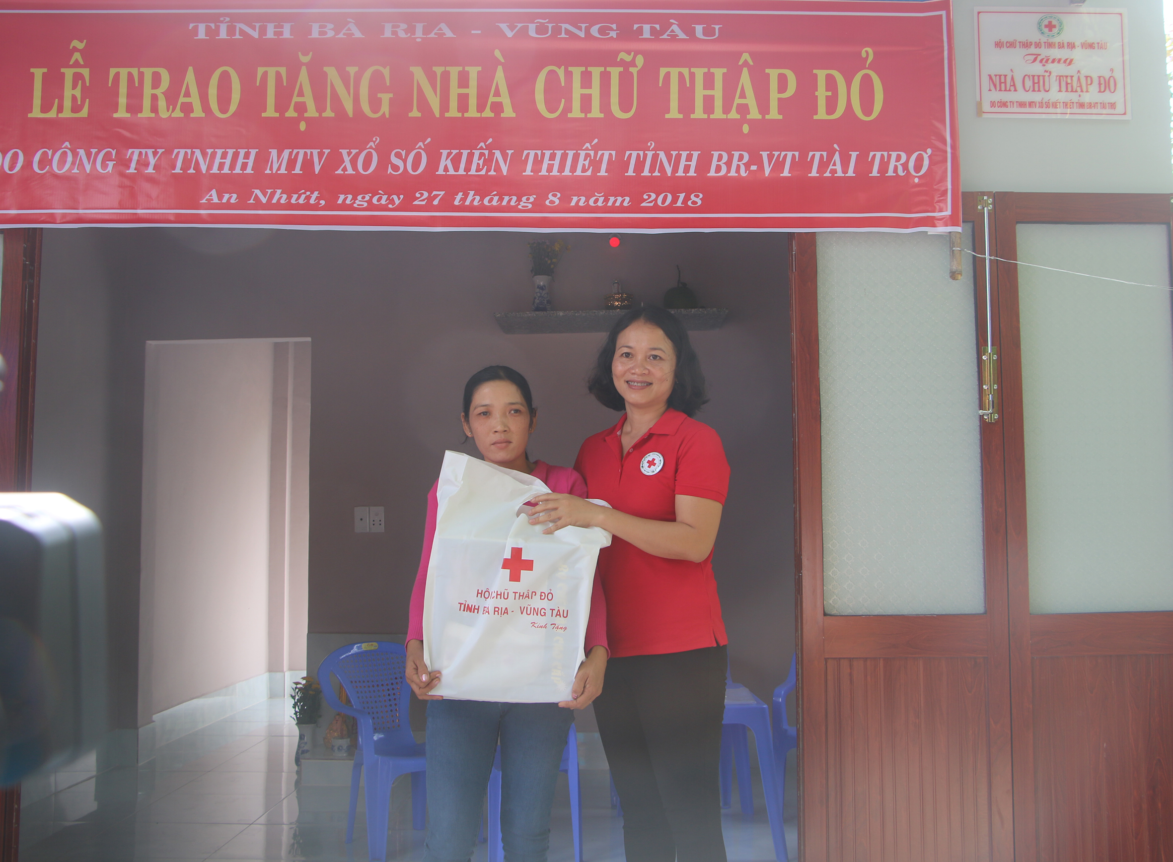 | Chị Hà Thị Việt Bắc, Phó Chủ tịch Hội Chữ thập đỏ tỉnh tặng quà chị Phan Thị Yến Oanh (ấp An Đồng, xã An Nhứt, huyện Long Điền) tại lễ trao tặng nhà Chữ thập đỏ tháng 8-2018. Ảnh: HOÀNG DƯƠNG |