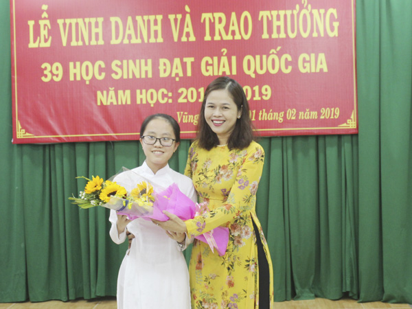 | Cô Lữ Thị Trà Giang, Hiệu trưởng Trường THPT Chuyên Lê Quý Đôn tặng hoa chúc mừng em Ngô Trần Anh Thư, đại diện cho 39 HS đoạt giải của tỉnh BR-VT. |