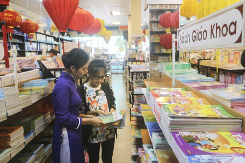| Nhân viên Nhà sách Nguyễn Du (17C Nam Kỳ Khởi Nghĩa, TP. Vũng Tàu) hướng dẫn HS mua SGK. Ảnh: KHÁNH CHI |