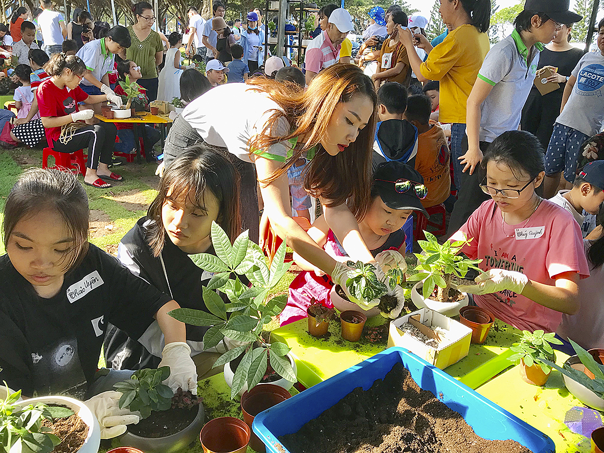 | Nhân viên Công ty UPC hướng dẫn các em cách trồng và chăm sóc cây xanh. |