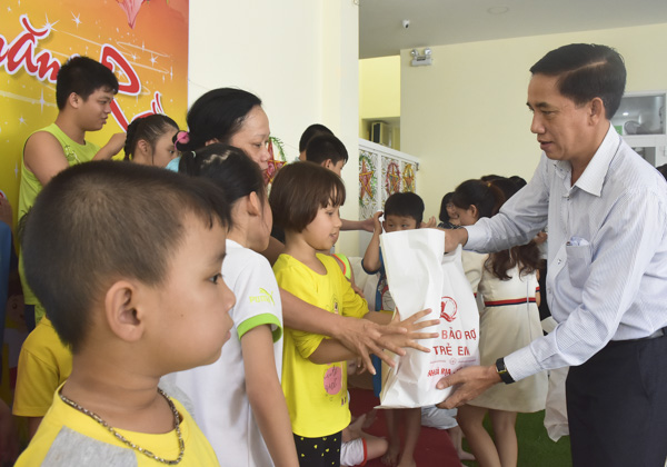 | Ông Trần Quốc Khánh, Phó Giám đốc Sở LĐTBXH tặng quà Trung thu cho các bé tại Trung tâm giáo dục hòa nhập Phước An. Ảnh: TUYẾT MAI |