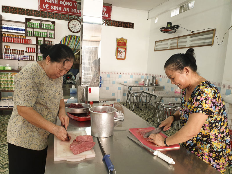 | Bà Bùi Thị Nhung và Bùi Thị Kim Cúc (bên phải) thái thịt bò chuẩn bị món phở phục vụ khách. |