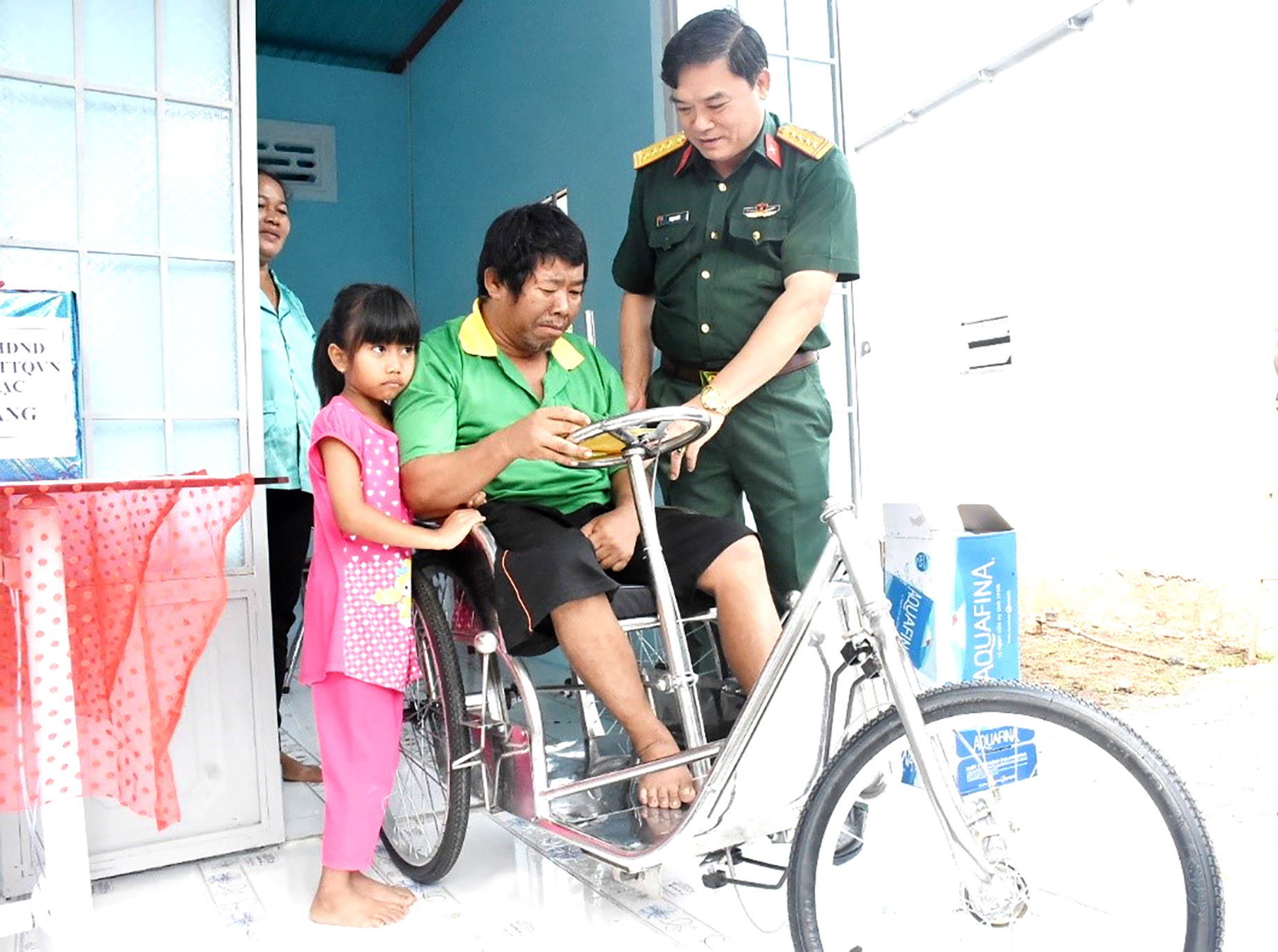| Đại tá Phạm Phú Ý, Ủy viên Ban Thường vụ Tỉnh ủy, Chỉ huy trưởng Bộ CHQS tỉnh trao xe lăn cho ông Dương Văn Lộc. |