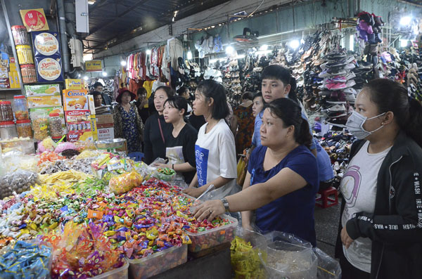 | Cuối năm lượng hàng hóa đổ về chợ nhiều, người dân cần nâng cao cảnh giác về nguy cơ cháy nổ. Trong ảnh: Các tiểu thương chợ Vũng Tàu sắp xếp hàng Tết lên kệ. Ảnh: ĐÔNG HIẾU |