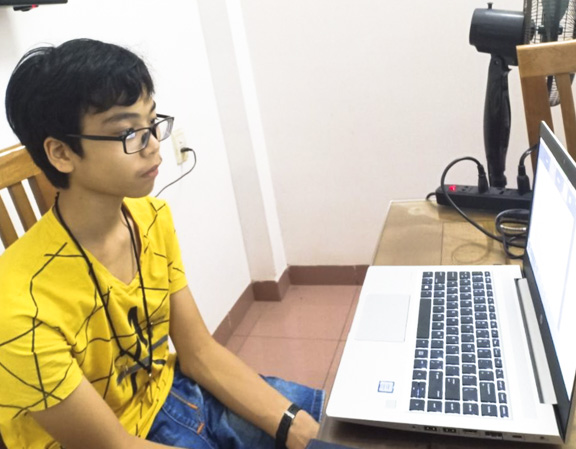 | Internet quá tải gây khó cho học sinh học trực tuyến. Trong ảnh: Em Bùi Gia Tường, lớp 8.7, Trường THCS Nguyễn An Ninh, học online tại nhà. |