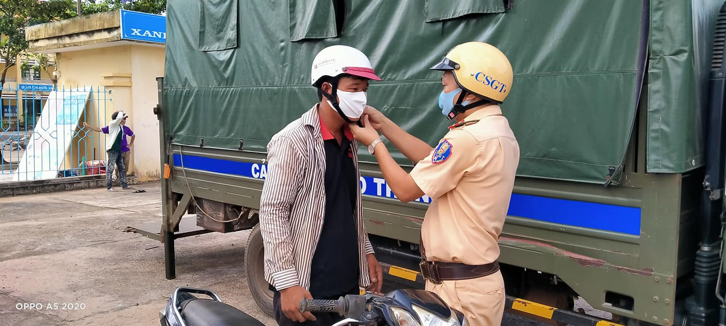 Bằng hình thức tuần tra kiểm soát kết hợp tuyên truyền việc đeo khẩu trang phòng, chống dịch bệnh COVID-19, Đội đã phát 300 khẩu trang tặng 40 mũ bảo hiểm cho người đi xe mô tô, xe gắn máy trên tuyến tỉnh lộ 329.