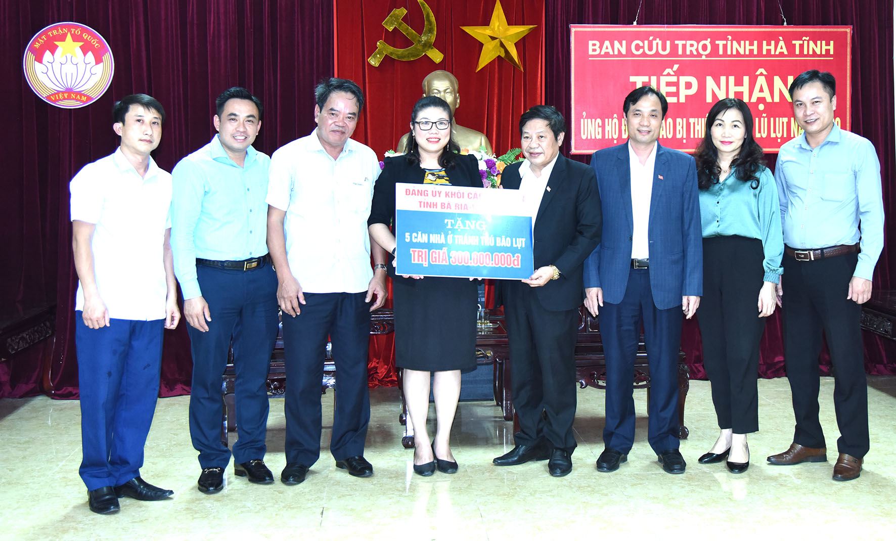 Trong đó, Đảng ủy Khối Cơ quan và DN tỉnh BR-VT trao tặng 5 căn nhà ở tránh bão lũ trị giá 300 triệu đồng; ông Hoàng Anh Giáp, Công ty TNHH Đầu tư Xây dựng Thương mại Hoàng Gia trao tặng 10 căn nhà ở tránh bão lũ trị giá 600 triệu đồng và 100 triệu đồng tiền mặt hỗ trợ hoạt động MTTQ các cấp tỉnh Hà Tĩnh.