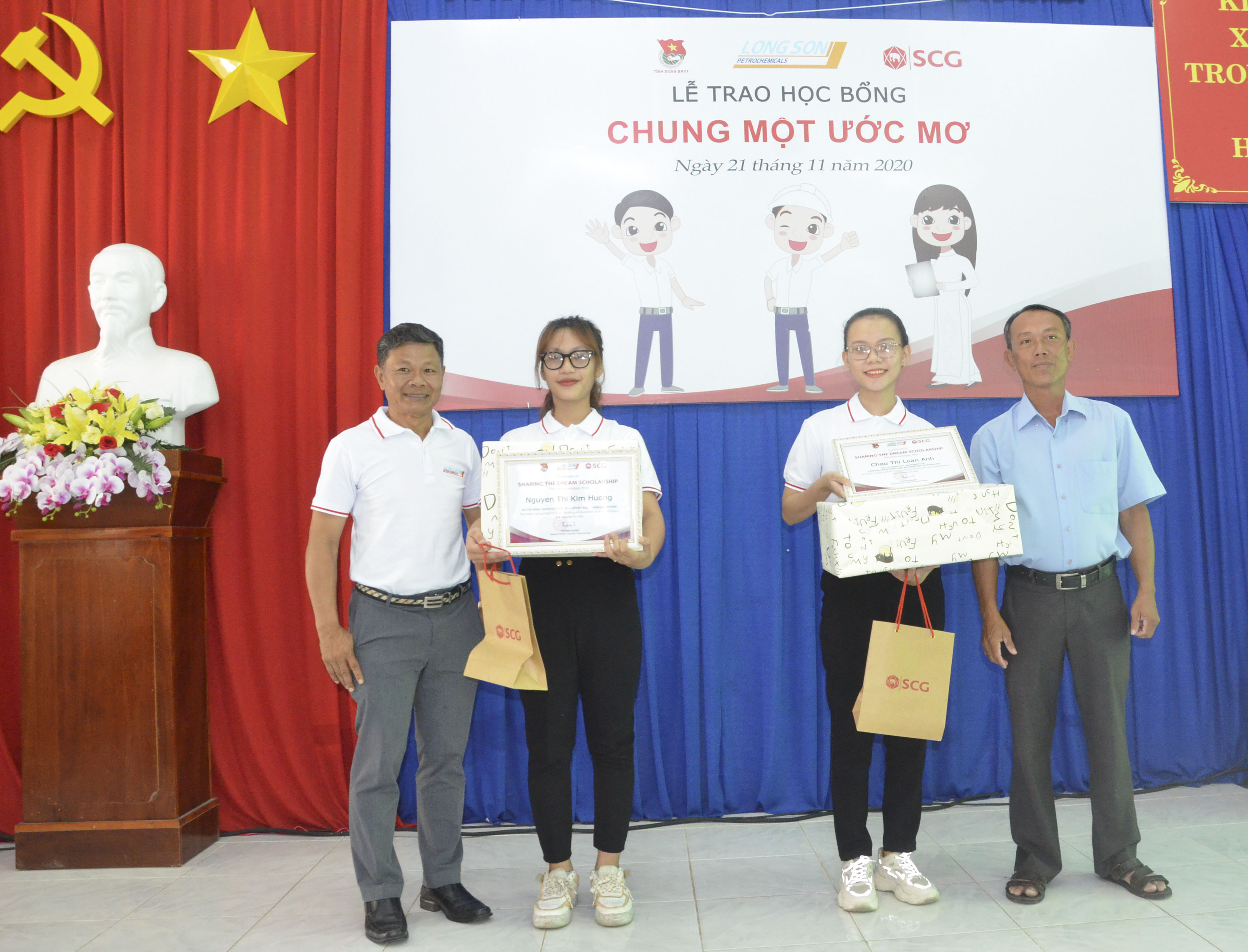 Tại buổi lễ, đại diện công ty đã trao học bổng trị giá 15 triệu đồng/năm học cho 4 SV ngụ xã Long Sơn, vừa trúng tuyển các trường đại học tại TP. Hồ Chí Minh gồm: Châu Thị Loan Anh, Dương Thị Hồng Ngọc (cùng SV Đại học Ngoại ngữ - Tin học), Nguyễn Thị Kim Hương (SV Đại học GT-VT) và Nguyễn Minh Tuấn (SV Đại học Gia Định). Các em sẽ nhận học bổng trong những năm học kế tiếp với điều kiện điểm tổng kết từ 7,5 trở lên. Ngoài ra, sau khi tốt nghiệp, các SV vượt khó học tập sẽ được ưu tiên làm việc tại công ty.