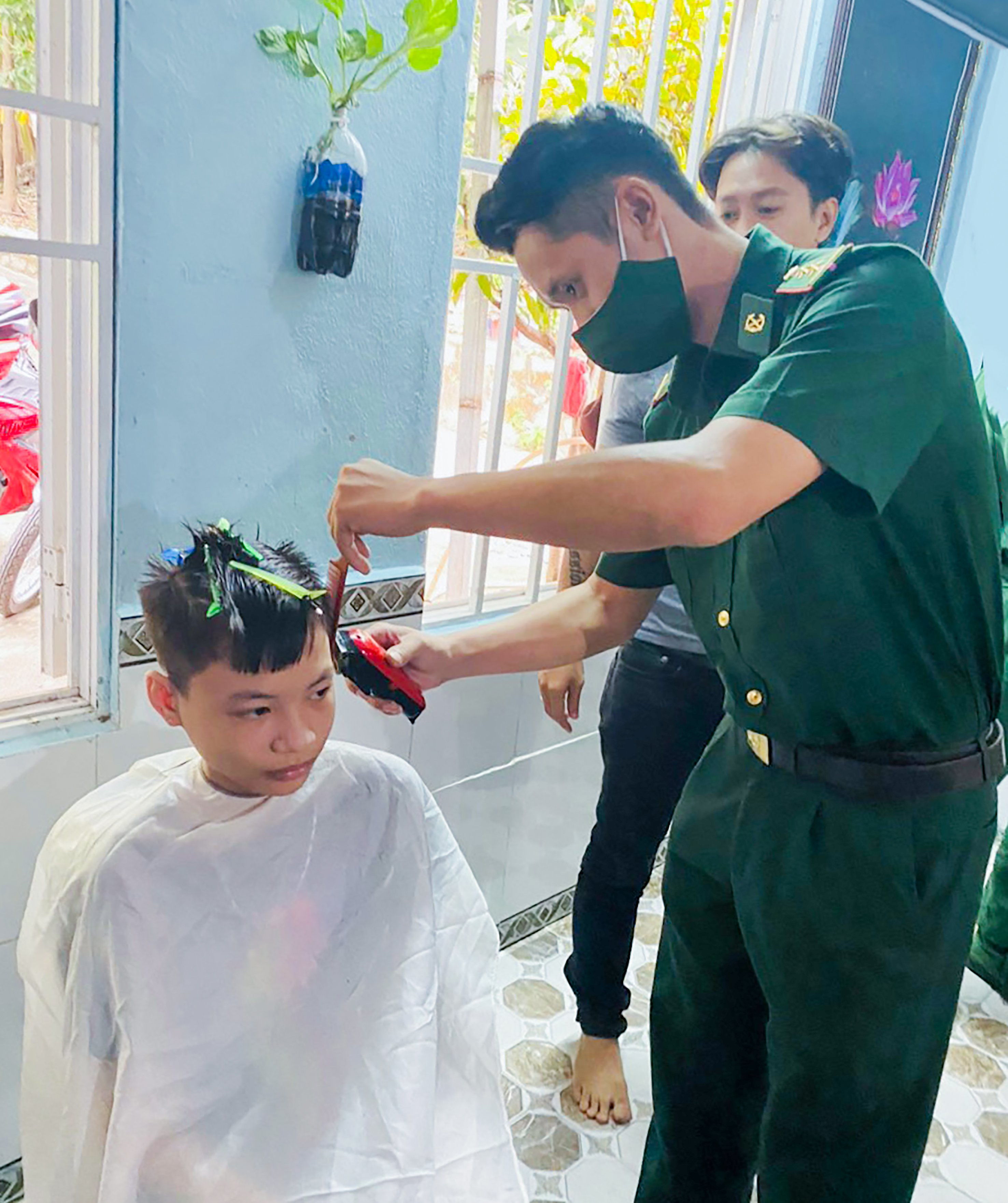 | Cán bộ, chiến sĩ Đồn Biên phòng Bến Đá cắt tóc miễn phí cho thiếu nhi tại lớp học tình thương. |