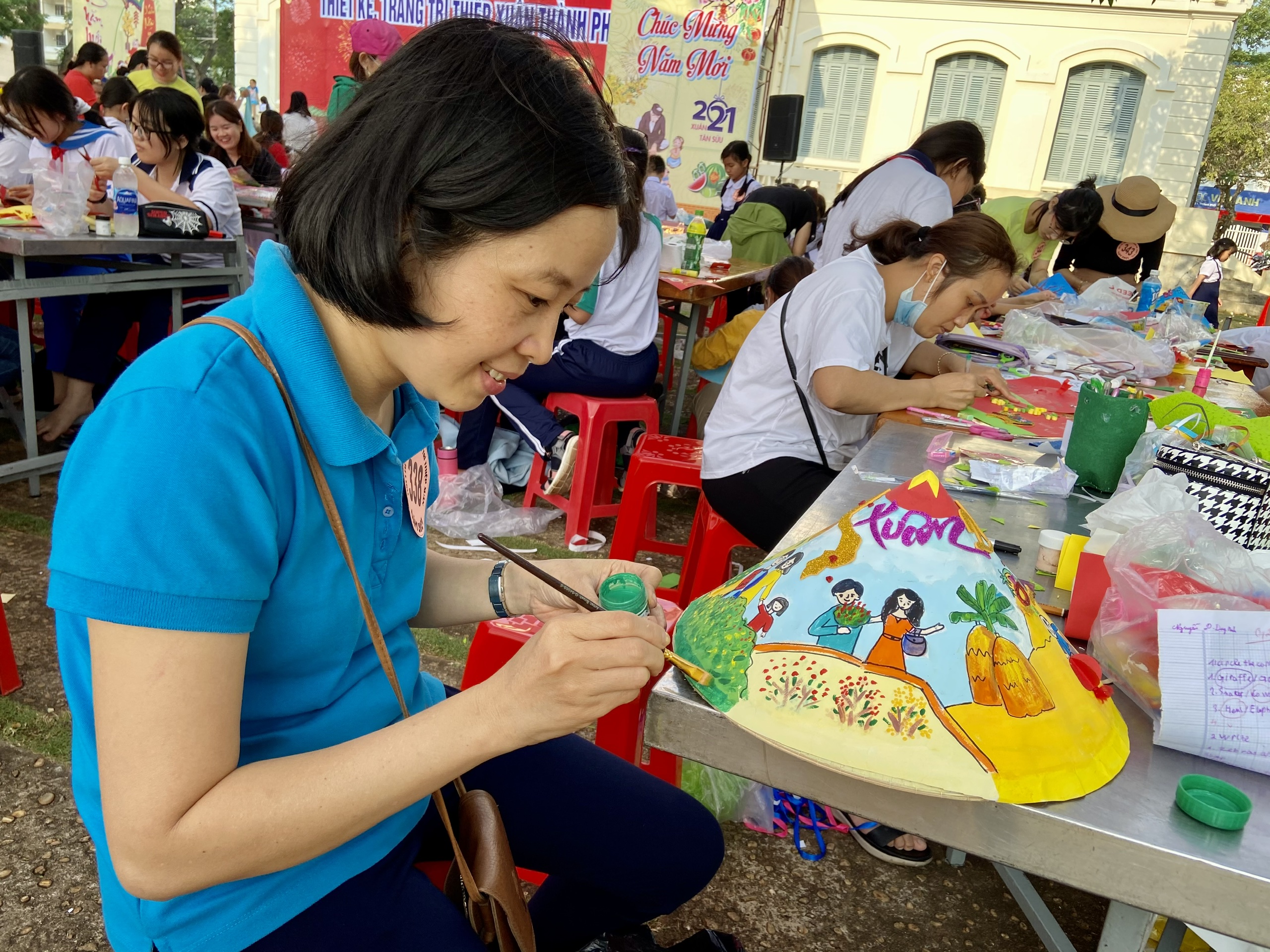 Ngoài học sinh, Hội thi thiết kế, trang trí thiệp Xuân Tân Sửu 2021 còn còn sự tham gia của nhiều GV ở các trường TH, THCS trên địa bàn thành phố. Với chất liệu nón lá, cô Nguyễn Thị Thanh Thúy, GV tiếng Anh, trường TH Hòa Bình đã khắc họa rõ nét và chân thật, làm nổi bật không khí đón Tết ở các làng quê lẫn phố thị. Tấm thiệp thể hiện những hình ảnh ở vùng thôn quê, ngày cận Tết, các gia đình quây quần gói và nấu bánh chưng, những em bé vui đùa dưới hiên nhà. Dọc các đường quê được trang hoàng nhiều lồng đèn và cây nêu với mong muốn mọi nhà đón mùa xuân rộn ràng, năm mới nhiều niềm vui và điều tốt lành. Riêng ở nơi đô thị, các gia đình đón Tết có phần hiện đại hơn. Gia đình có điều kiện mua hoa mai về chưng Tết. Đông đảo người dân đi chơi xuân và xem chợ hoa xuân…