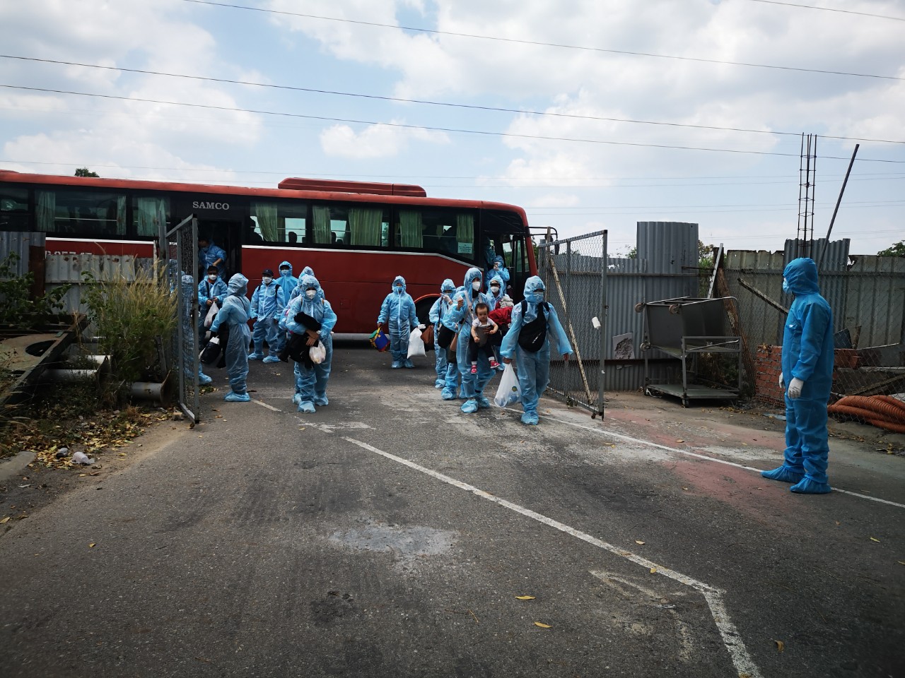 | Các công dân trở về từ Đức được mang đồ bảo hộ phòng, chống dịch bệnh COVID-19 từ khi lên máy bay đến nơi cách ly tập trung tại KTX Trường CĐ Quốc tế Vabis Hồng Lam (TX. Phú Mỹ). |