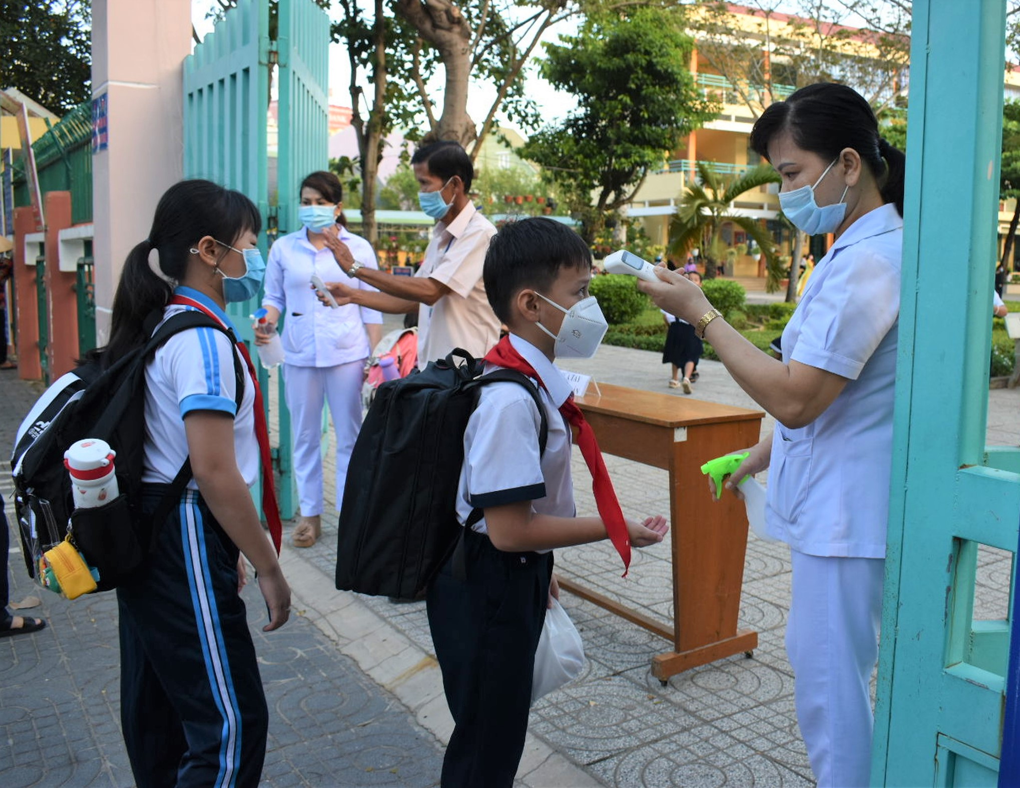 | Nhân viên y tế kiểm tra thân nhiệt và sát khuẩn cho HS trước khi vào lớp tại trường TH Lê Thành Duy, TP. Bà Rịa. |